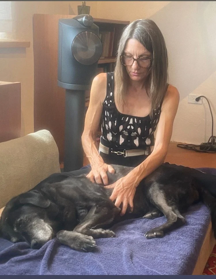 Animal Somatics is a non-invasive practice involving slow, deliberate touch (ie: stroking the spine or chest) to calm the mind and body.